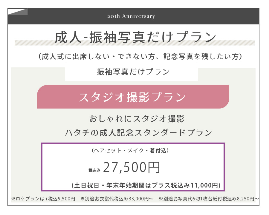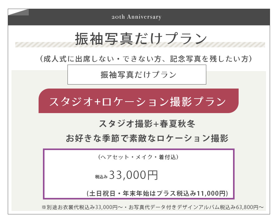 写真だけプラン夏の成人式の方成人式に出席できない方振袖をお持ちの方撮影プラン①②+撮影時衣裳レンタル(または持ち込み振袖)ABC+お写真代①振袖写真だけレンタルプランA.撮影時衣裳レンタル豊富な振袖の中からお気に入りの1着を選べる!古典柄・モダン・ヴィンテージなどたくさんの種類を取り揃えておりますB.撮影+撮影後そのままおでかけレンタルせっかくの振袖姿そのままおじいちゃんおばあちゃんに見せたり家族で記念のお食事にも振袖・小物一式 一泊二日¥55,000~※成人式当日は除くC.振袖持ち込みお家に振袖をお持ちの方持ち込みの振袖で足りない小物はご購入・レンタル出来ます※成人式当日のお支度もご希望の方は成人式当日お支度代14,300円が発生致しますお早めにご予約下さい他|お支度済み撮影プラン撮影のみのプラン美容室様にてお支度が出来上がった状態でご来店ください・写真6切り1枚入り台紙付きスタジオ撮影プラン¥13,200スタジオ+ロケーション撮影プラン¥18,700WEB予約はコチラから →more plan →